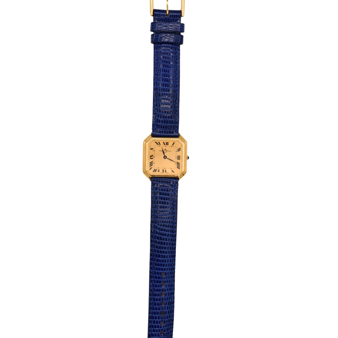 Fabriquée avec une attention méticuleuse aux détails, cette montre d'inspiration vintage présente un magnifique boîtier en or jaune, façonné dans un luxueux or 750/1000ème. Nous comprenons le désir de qualité durable, c'est pourquoi cette montre est dotée d'une verre saphir robuste et résistant aux rayures. L'affichage classique analogique ajoute à son charme sophistiqué.