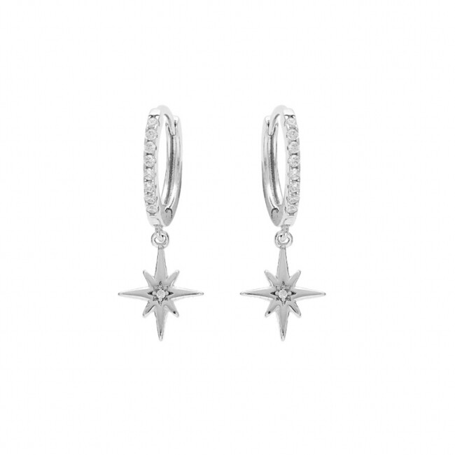 BOUCLES D'OREILLES ARGENT RHODIÉ CRÉOLES ARTICULÉES OXYDES BLANCS SERTIS ET PAMPILLE ETOILE