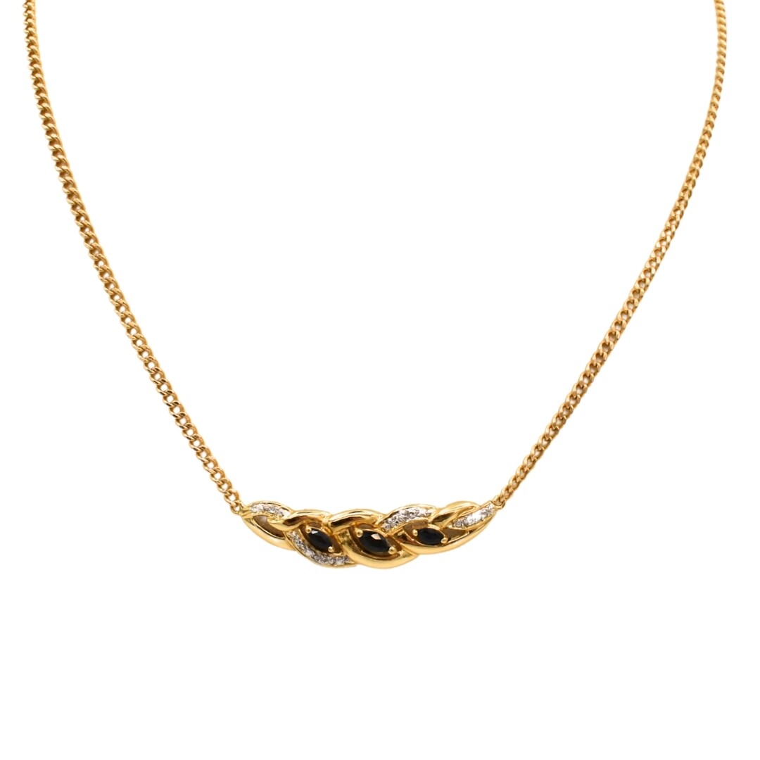 Ce magnifique collier en or jaune 18k séduit par son design raffiné et la beauté de ses trois saphirs taillés en forme navette. Leur éclat bleu profond contraste parfaitement avec la chaleur de l’or jaune, créant un bijou élégant et intemporel.