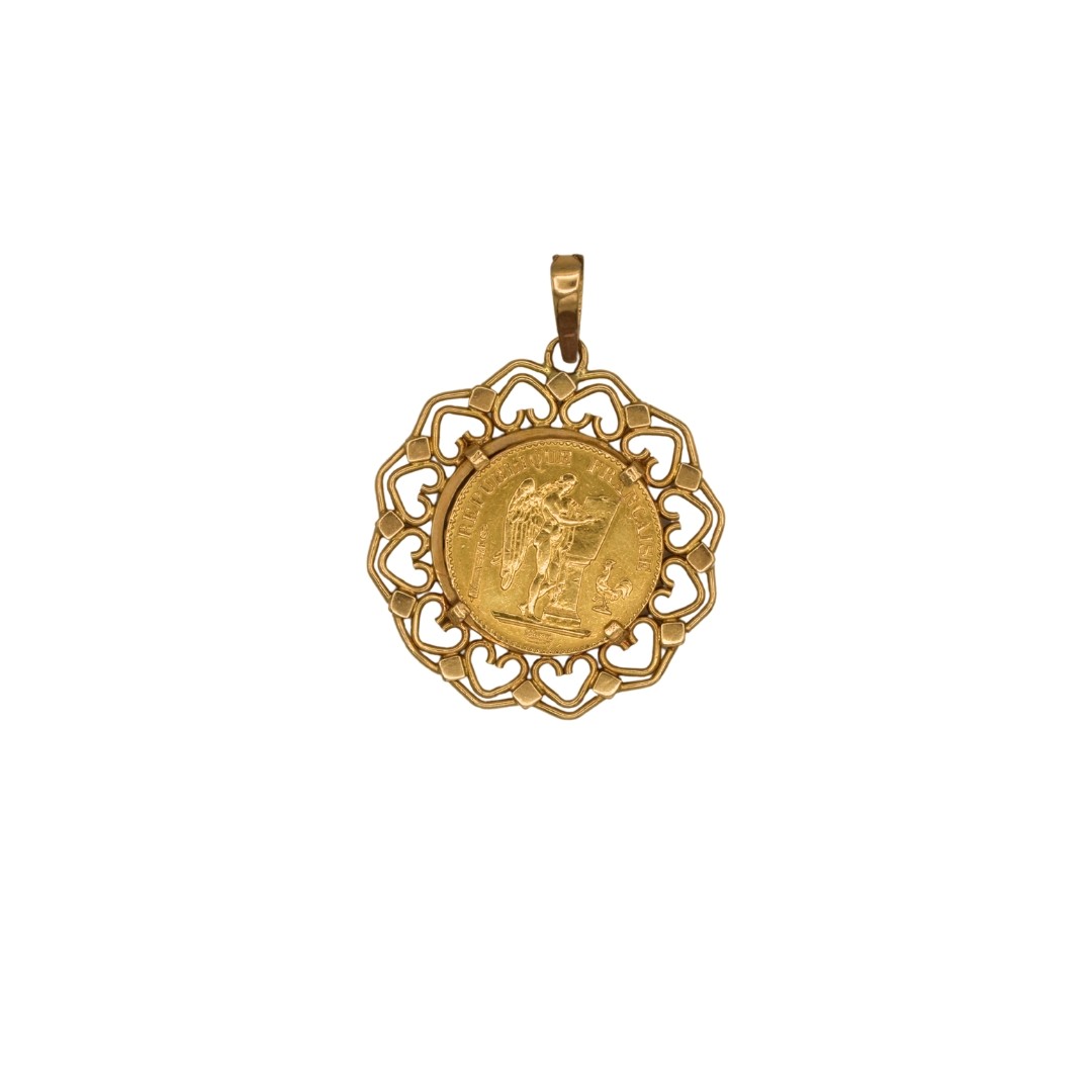 Ce pendentif porte pièce en or jaune 18k met en valeur une authentique pièce de 20 Francs au motif emblématique de l’ange écrivant. Symbole de chance et de protection, cette pièce historique devient un véritable bijou à porter au quotidien. Une pièce élégante et pleine de caractère pour les amateurs de numismatique et d’originalité.